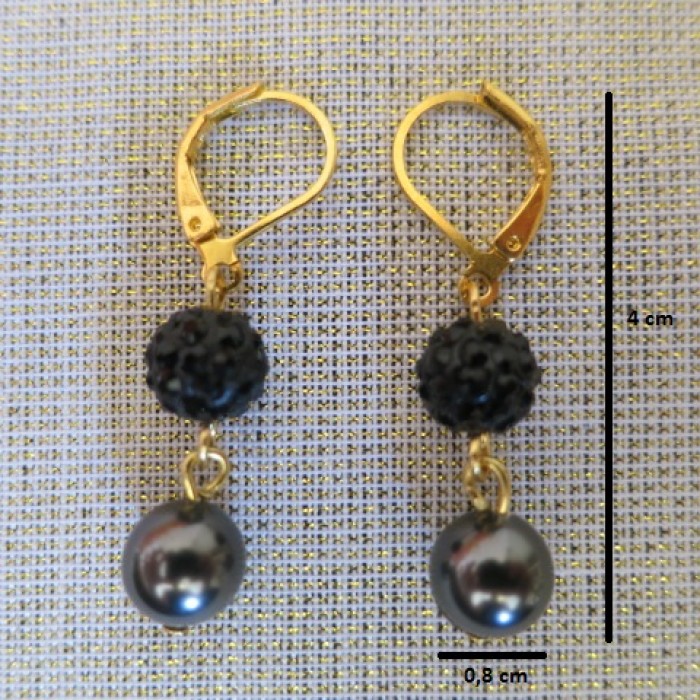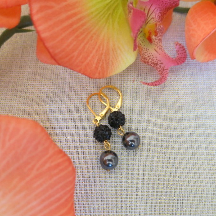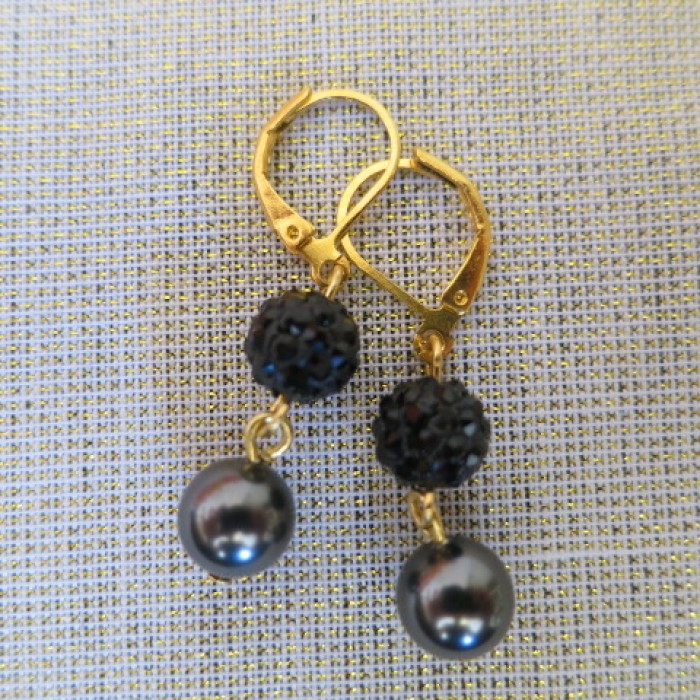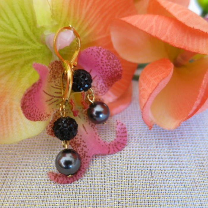 Auskari ar tumši pelēkiem Swarovski pērlēm un Swarovski melniem kristāliem, zelta pārklājums 24 karāti
