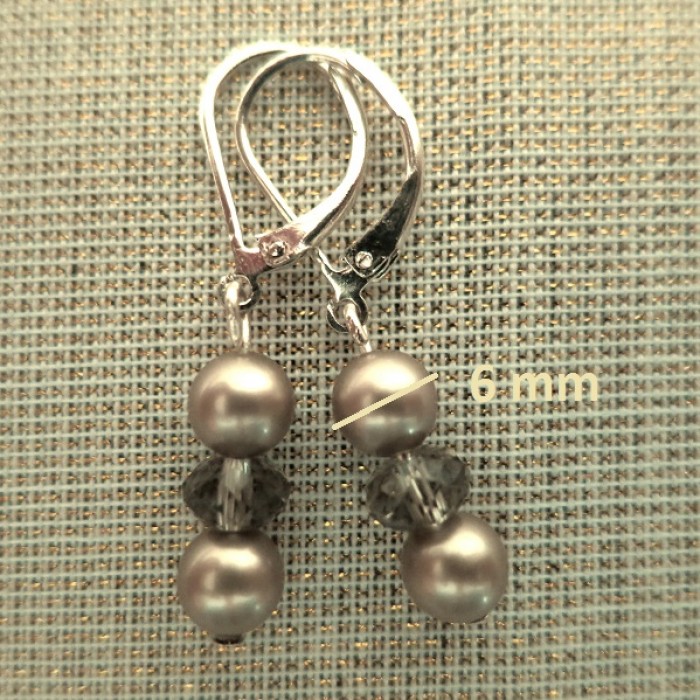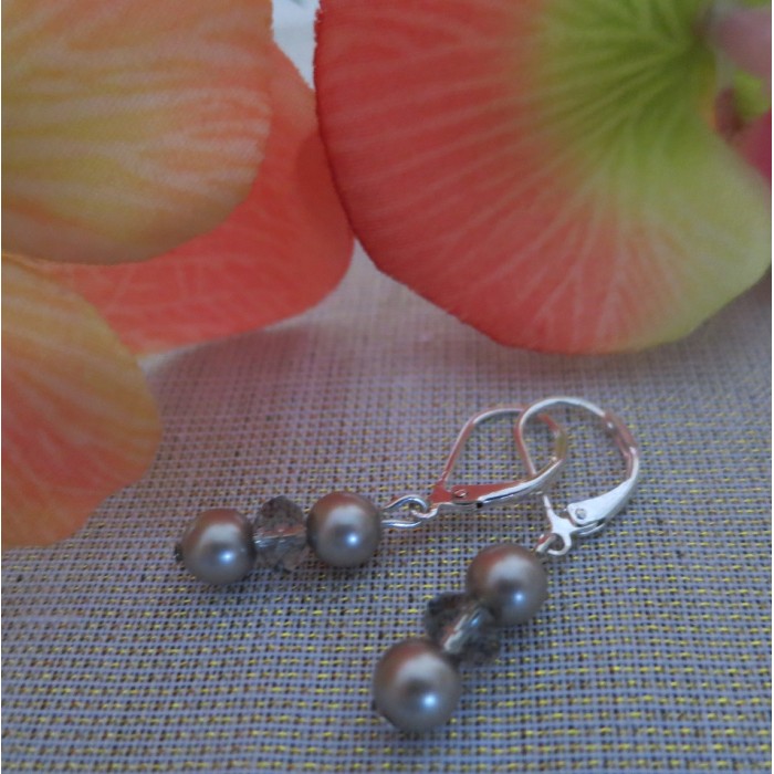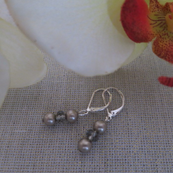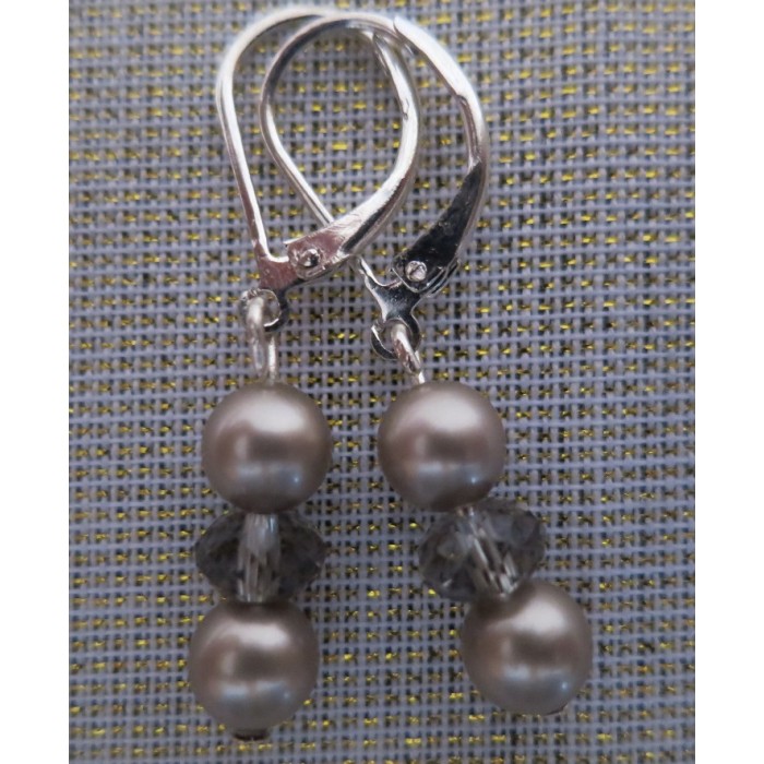Eleganti SWAROVSKI kristāla pērļu auskari ar Swarovski kristāliem vēsi brūnganā tonī, Apsudrabotas metāliskās detaļas