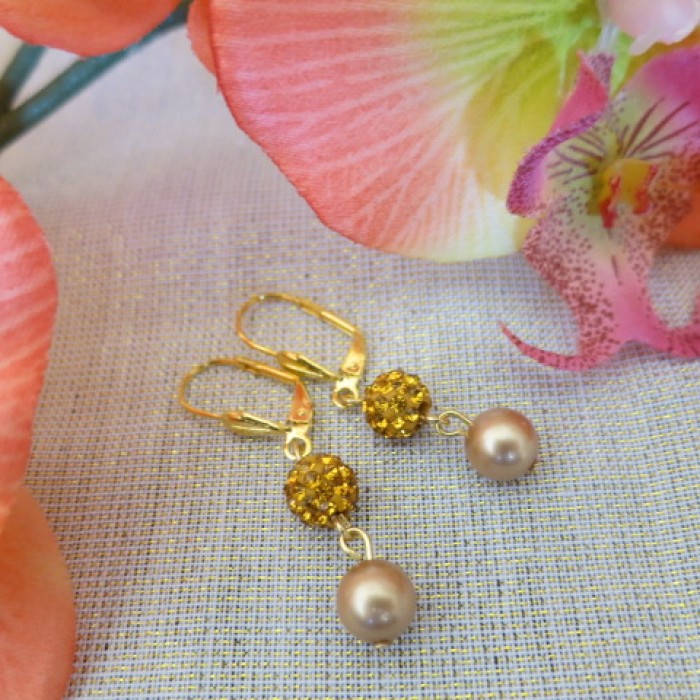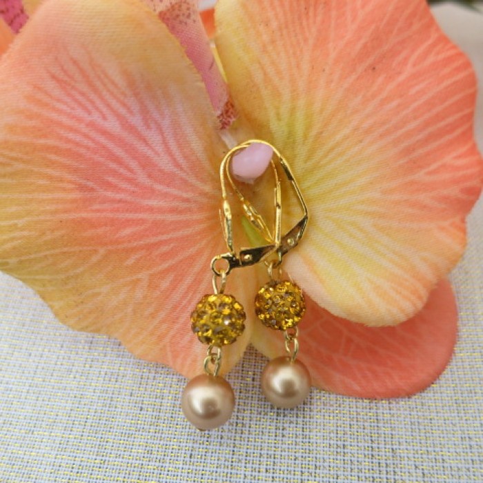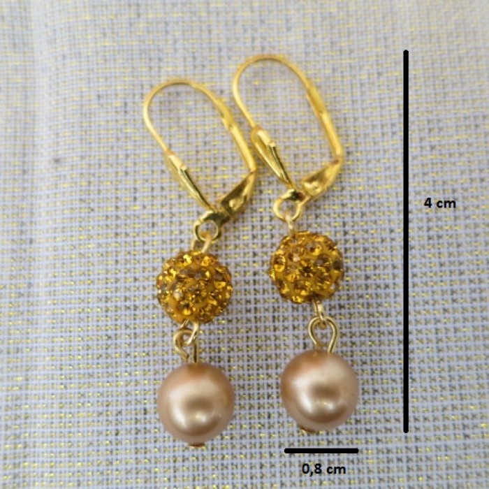 Eleganti auskari "Gold Pearl" rotāti ar zeltainam Swarovski pērlēm un kristālu mirdzošajām pērlēm, 24 karātu zelta pārklājums